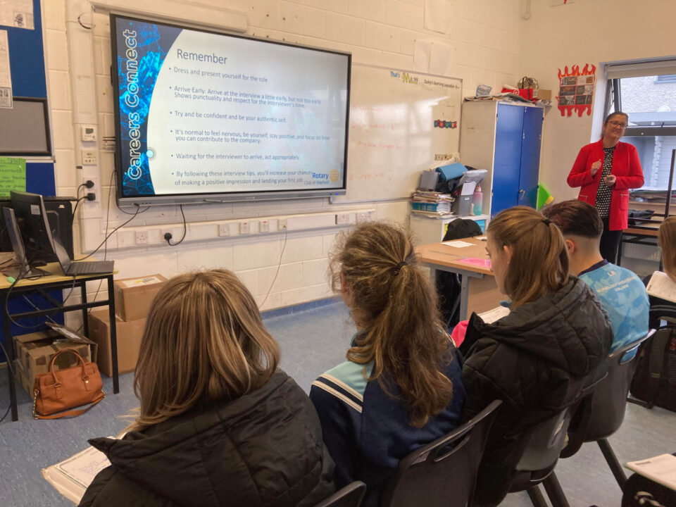 Wexford Rotary Club member Dara O’Leary gave a highly informative talk entitled CV Workshop and Interview Skills to TY students at Bunclody Community College. Dara runs her own HR consultancy business and has vast experience in the HR field. She shared her knowledge, expertise, insights and personal stories with the students.